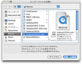 ビデオ入力のための外部装置を開くことに失敗した場合は、 右上の図のようなウィンドウが表示され、代わりのムービーファイルを指定するよう促します。 指定したムービーを再生して得られる画像をカメラからの入力のように扱います。 ムービーは繰り返し再生されます。 ムービーファイルを指定せずにキャンセルボタンをクリックすると、 ビデオ入力の機能は無視され、エージェントは外部からの影響をまったく受けずに自律的な群れ行動をします。