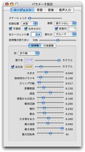 タブを使って、エージェントの描き方と行動を制御するパラメータを変更することができます。