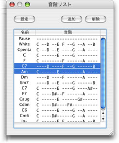 追加ボタンをクリックすると、現在設定されている音階が リストに追加されます。リスト中に既に同じ音階が登録済みの場合は、 追加ボタンをクリックできないようになっています。