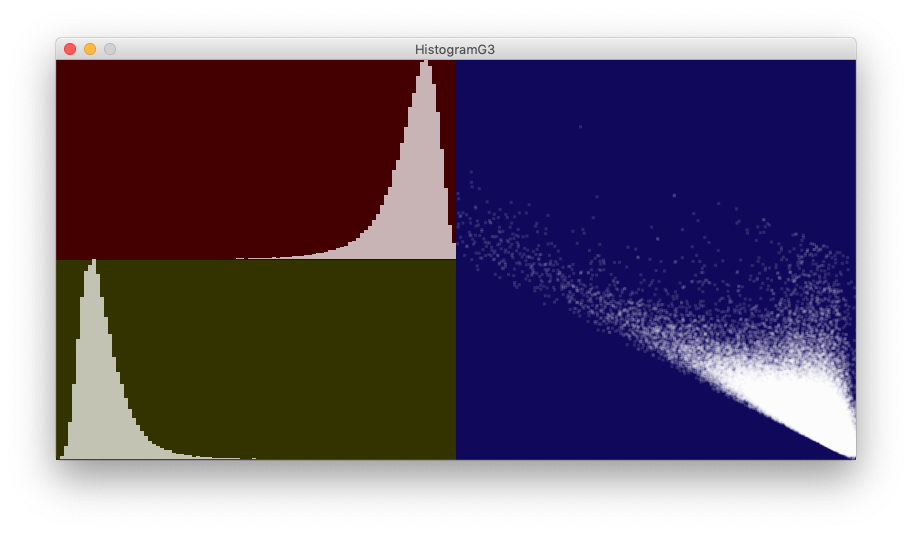 }下の各図中,左上は元の乱数 \(x\) のヒストグラム,左下は生成した乱数 \(y\) のヒストグラム,右は横軸に \(x\) 縦軸に \(y\) をとった散布図である。いずれも最頻値は \(m_x = 0.9, m_y = 0.1\),相関係数は上から \(0, 0.5, -0.5\) である。