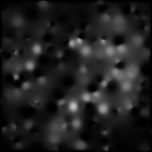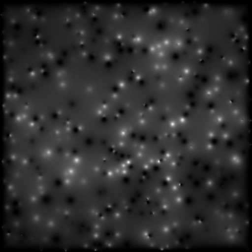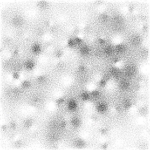 下に代表点の座標を一様乱数で与え生成したパターンの例を示す。白が \(D(x,y)=1\) 黒が \(0\) で,灰色はその中間である。