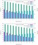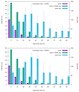 つぎに示す左側の図は,全体の人口に占める感染者の割合の時間変化について,10回の試行の各ステップでの平均をとったものである。 4つのグラフ中,左側の2つは全体を表示したものであるが,捕捉率 40% 以上では,感染者数割合が低く,グラフでは見づらいので,縦軸の最大値を 1% としたグラフを右側の2つで示す。 この指標は陽性判明者数とは異なるので,現実に測定することが難しいという点には注意されたい。 右側の図には,ピーク時の感染者数,200日分実行後の累積感染者数,ピークの日付の平均値を示す。