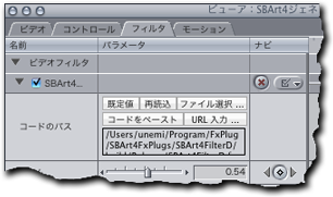 SBArt4 からコードを取り込む各エフェクトには、最初から既定値としてコードが含まれていますが、 コピー&ペースト、あるいは、ファイルへの保存と読み込みの操作によって、 SBArt4 で生成したコードに取り替えることができます。右の例のように各エフェクトのパラメータには「コードのパス」という項目があり、