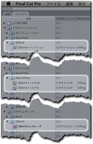ダウンロードここをクリック して、パッケージをダウンロードし、 フレームワークとプラグインをインストールしてください。 インストール中に、個人用の場所か、システム全体用の場所のどちらにインストールするか選択できます。ビデオエフェクトパッケージのインストールが終了してから、 Final Cut Pro/Express を立ち上げてください。 エフェクト一覧の、ビデオトランジション、ビデオフィルタ、ビデオジェネレータの各ビンの下に SBArt4 というビンがあるはずです。それぞれの中にビデオエフェクトが入っています。