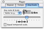 Repeat tab has two radio buttons by which you can choose how to play the music. The scores are played repeatedly when the upper radio button is pressed. They are played only once when the lower radio button is pressed. Tempo tab is to change the speed of play. The user can change the tempo in the range from 20 to 180 quarter notes per minute, by key input and operating the slider control. Clinking Apply button or pushing the return key applies the new value to the top field window, the top genome editor, or secondary selected bars of the top score window. Key/Scale tab is to set up the key and scale. You can change the key, that is the number of sharps and flats, by operating the slider. You can also fix the key note by operating the pop-up menu. The key note depends on the gene in the default state, but you can select fixed note ignoring the genotype. You can change the scale to the equal tempered scale in twelve notes per one octave by checking on the bottom check box. |